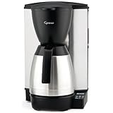 The Capresso MT600 coffee maker with stainless steel thermal carafe brews 10-cups of coffee in under 8 minutes for maximum flavor and aroma. The milled steel housing provides superior strength and style. 10-cup stainless steel thermal carafe with ergonomic handle, brew-through closed lid with drip-free pouring spout keeps coffee hot for hours and preserves aroma. Stainless steel lined heating system eliminate contact with aluminum and reduces the need for decalcifying. The included gold tone filter is easy to clean and eliminates the need for paper filters. Drip stop allows you to pour a cup while brewing. Charcoal water filter removes up to 82-percent of chlorine and other impurities from tap water. One charcoal filter and holder is included. Illuminated 24-hour programmable lcd digital clock/timer with soft touch controls. Special setting provides maximum aroma when brewing 3-5 cups. An electronic filter indicator shows when to replace the charcoal filter. Electronics retain all programming during short power outages. 10-cup programmable coffeemaker with stainless-steel-lined heating system Illuminated, 24-hour, LCD digital clock and timer; soft-touch controls Brew-pause function; 2-hour auto shut-off for safety; cord storage Includes stainless-steel thermal carafe, gold-tone filter, and charcoal water filter Measures approximately 9 by 8 by 14 inches